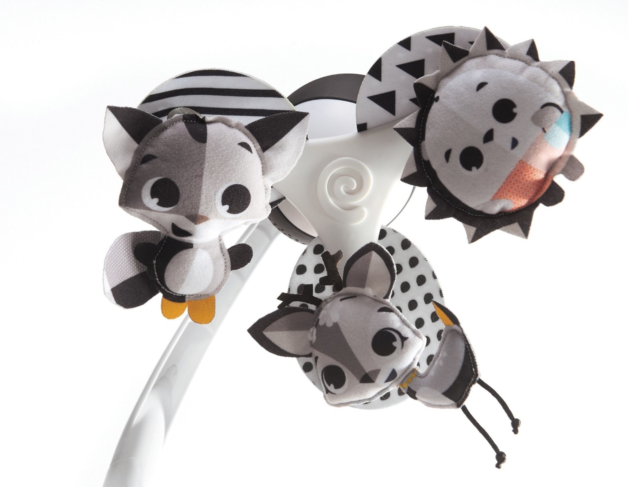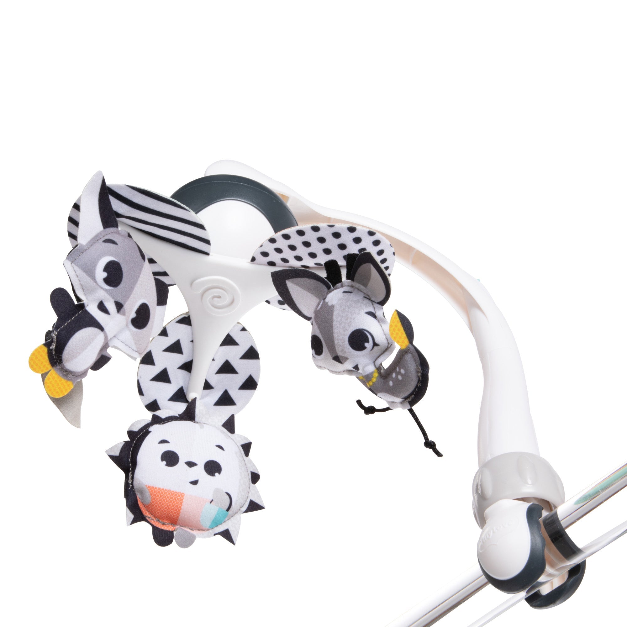 The Magical Tales™ Take-Along Mobile is designed to support your baby’s development at home or on the go. The engaging black and white contrasts and colorful hanging toys spin to provide visual stimulation for babies as their sight is still developing. Babies can practice their communication and language skills, while lying in their crib or sitting in their stroller, by cooing at the smiling characters. The cute Magical Tales toys stimulate baby's senses and encourage the development of fine motor skills. The mobile's clever design makes it easy to attach to most play yards, strollers, and bassinets, making it the perfect travel toy.