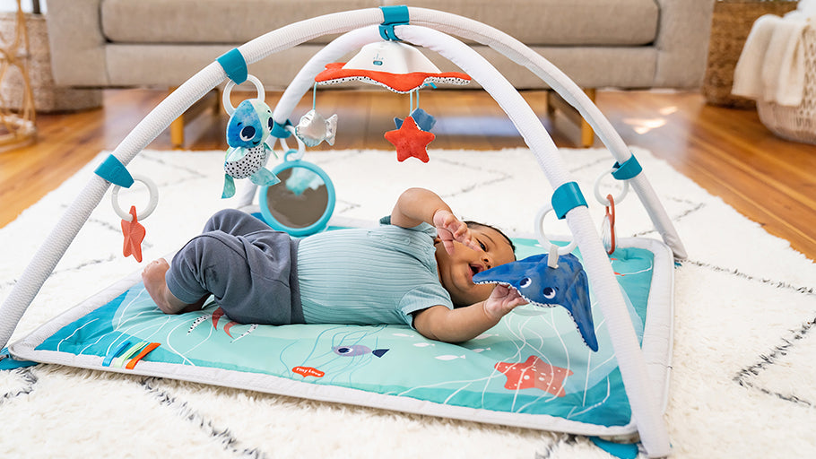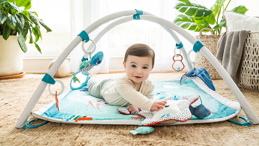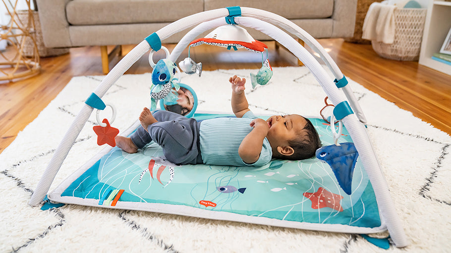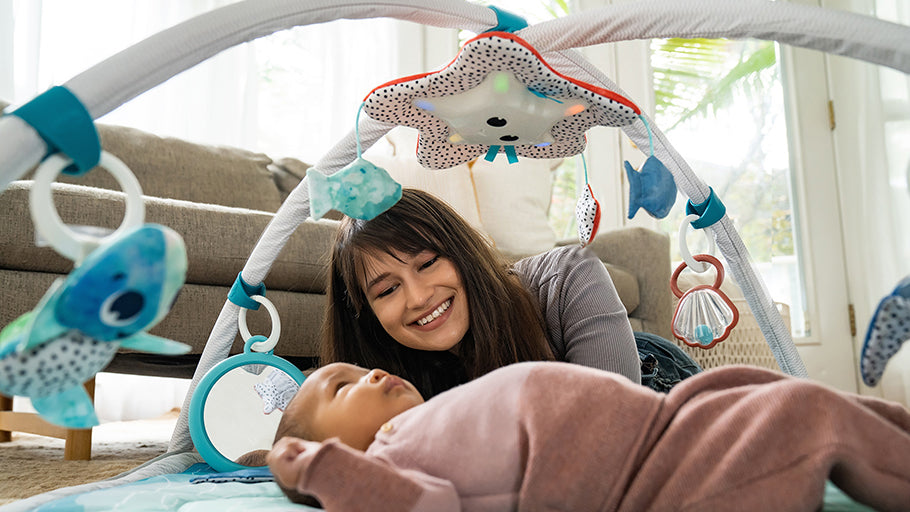 - Overhead mobile converts into a responsive Tummy time toy with visual & audio feedback that helps extend tummy time.