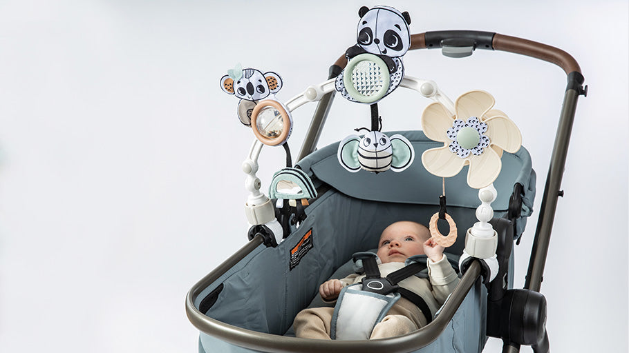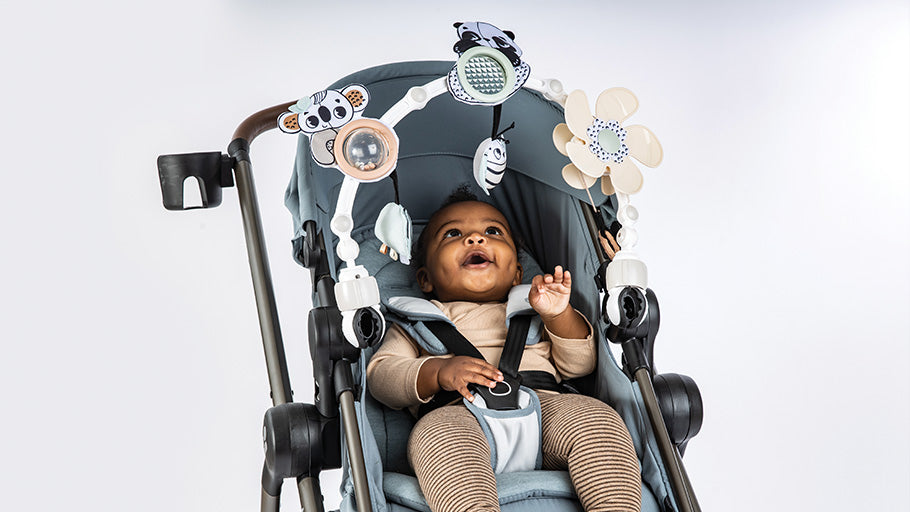 - Clever stroller toy with engaging activities and a flexible design that adapts to baby’s age and stage!