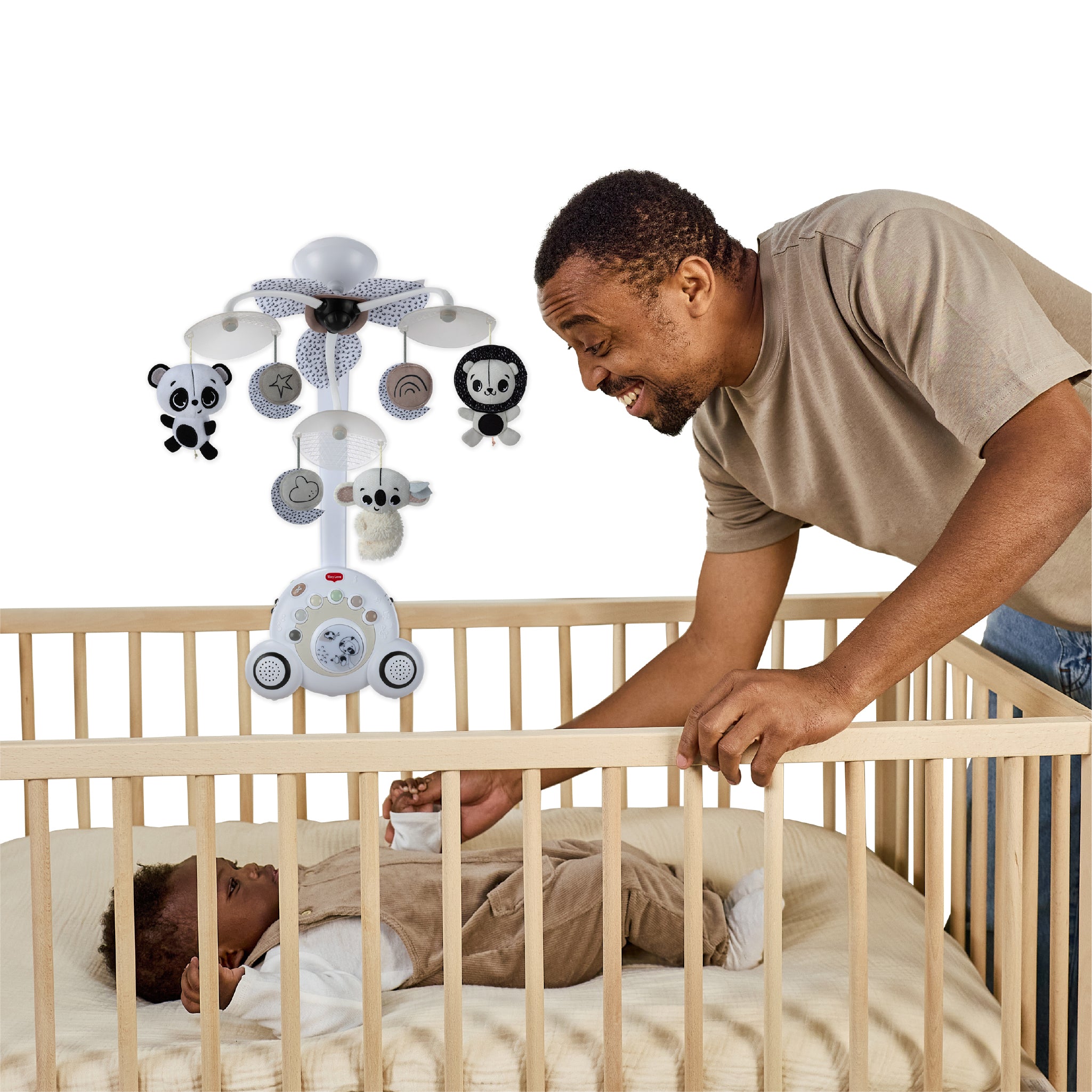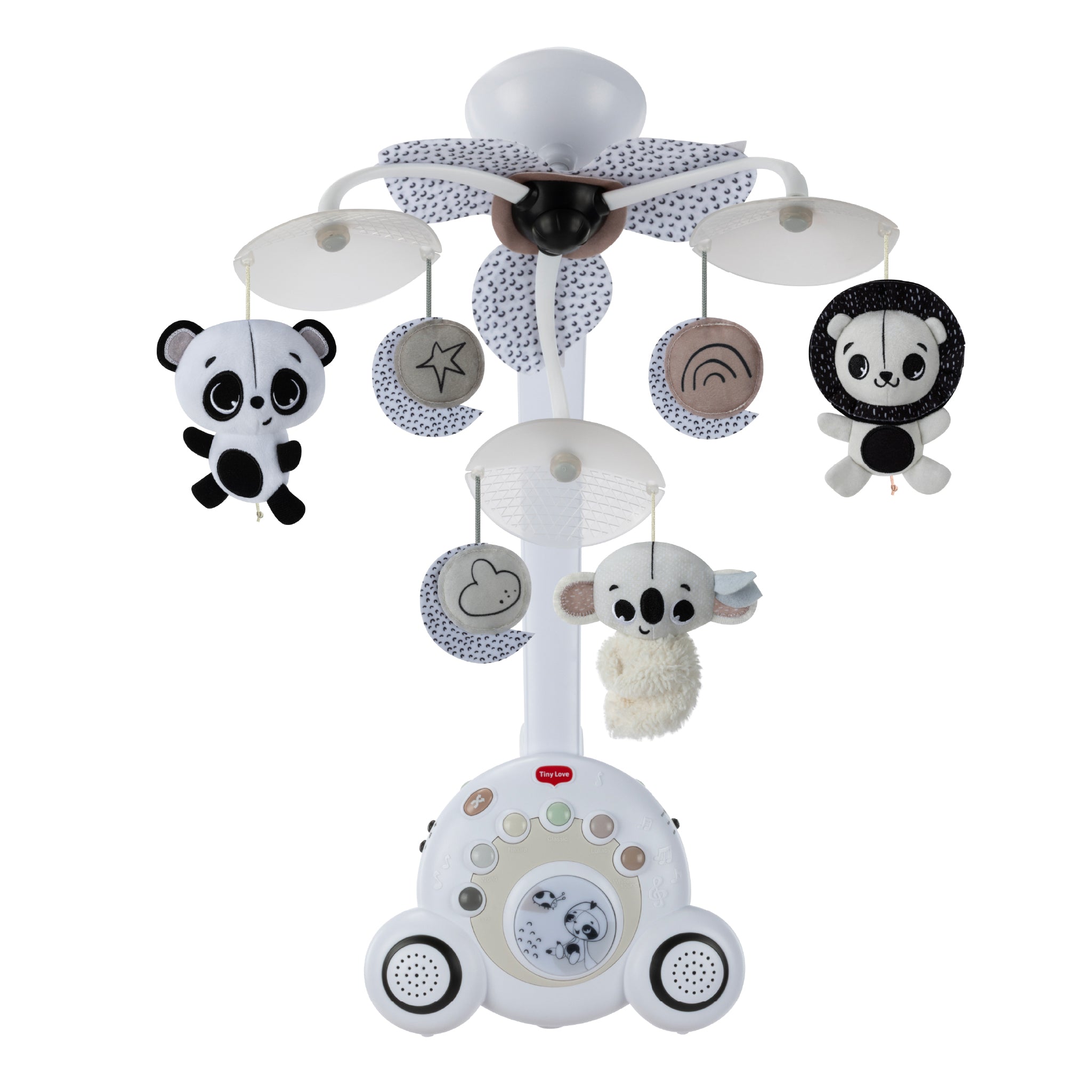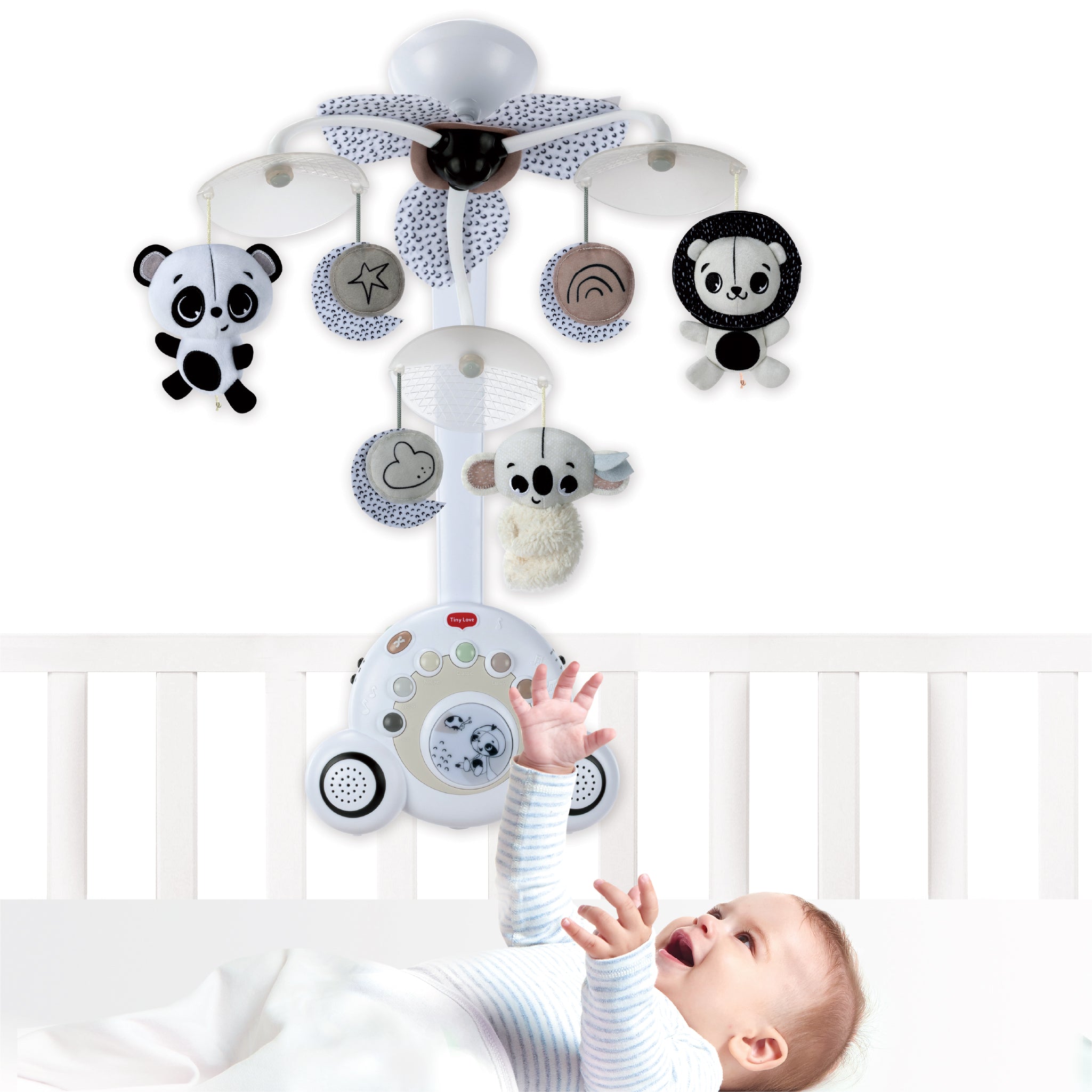 - Black & white musical mobile designed to soothe and support early development.
