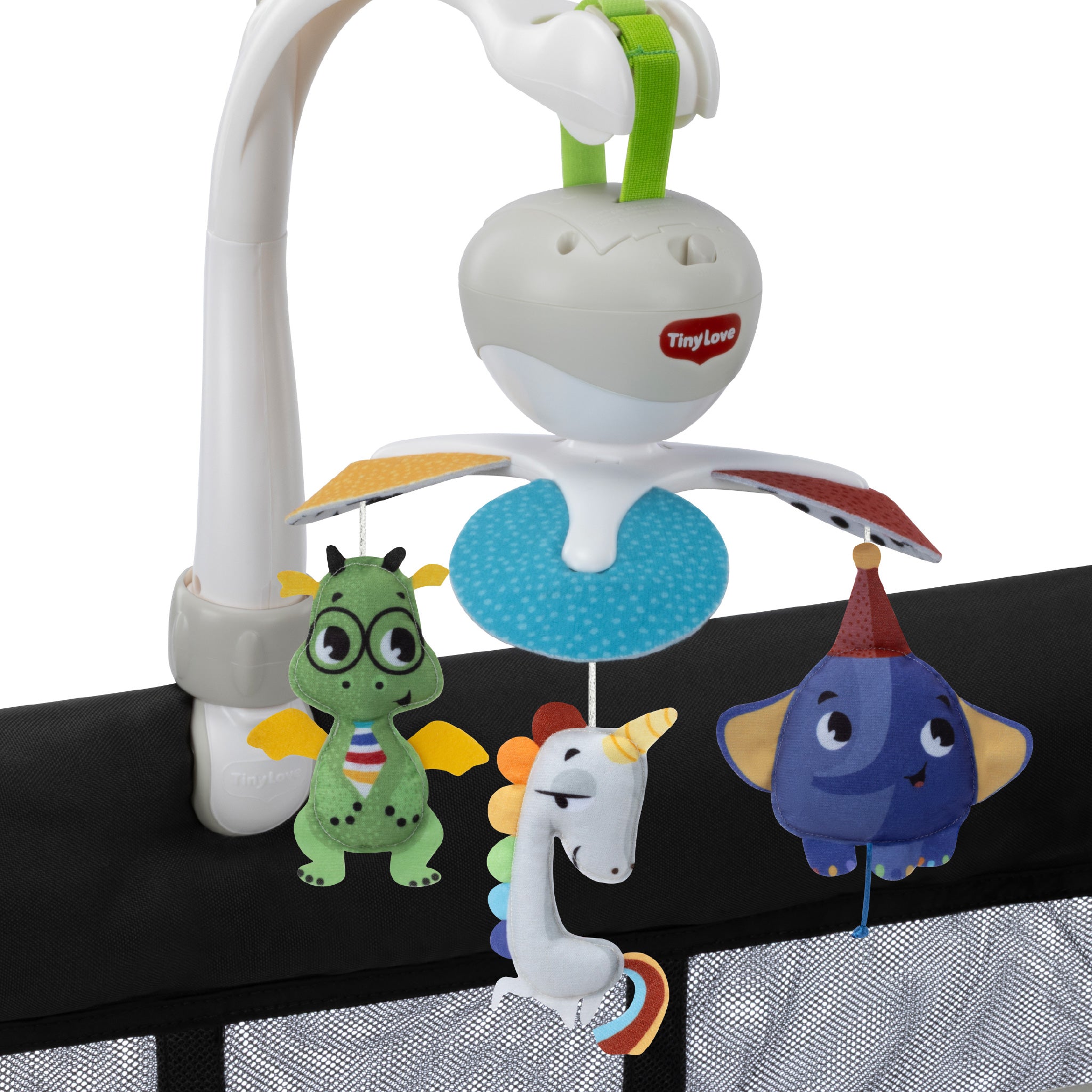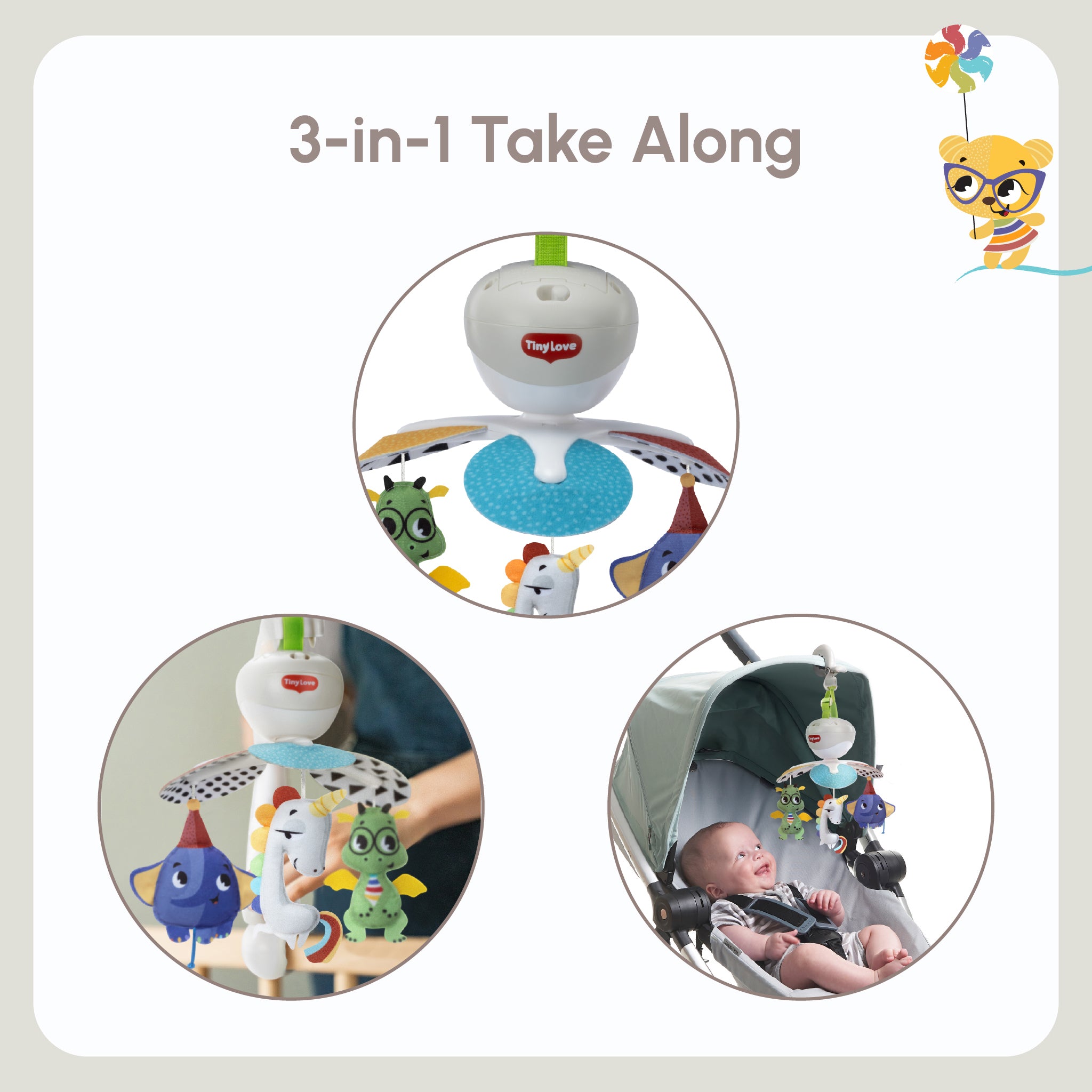 - 3-in-1 take along mobile that entertains your baby with a selection of melodies and a vibrant design!