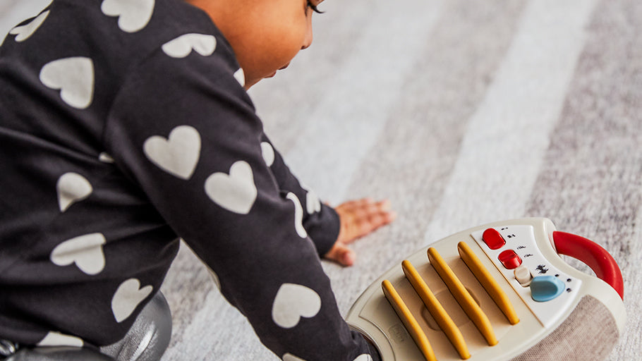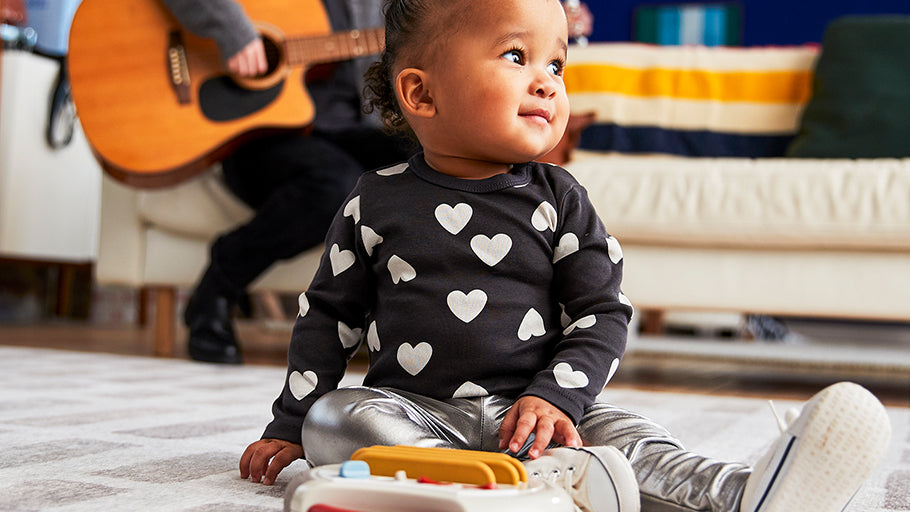 - Your baby's very first guitar, with unique movable strings designed to mimic the real guitar experience.