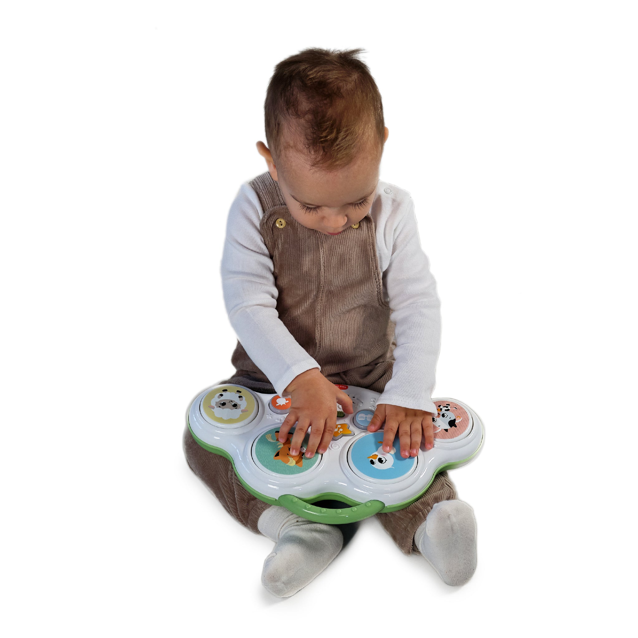 Fun drum pads with light-up buttons feature drum beats, funny sounds, and farm animal sound effects that invite little ones to explore and learn through play.