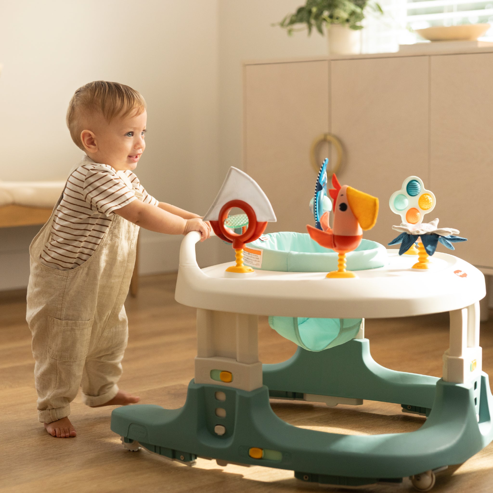 - Grows with you baby! Choose between 4 separate modes: stationary activity center, bouncer, push along and walker.