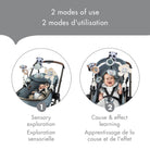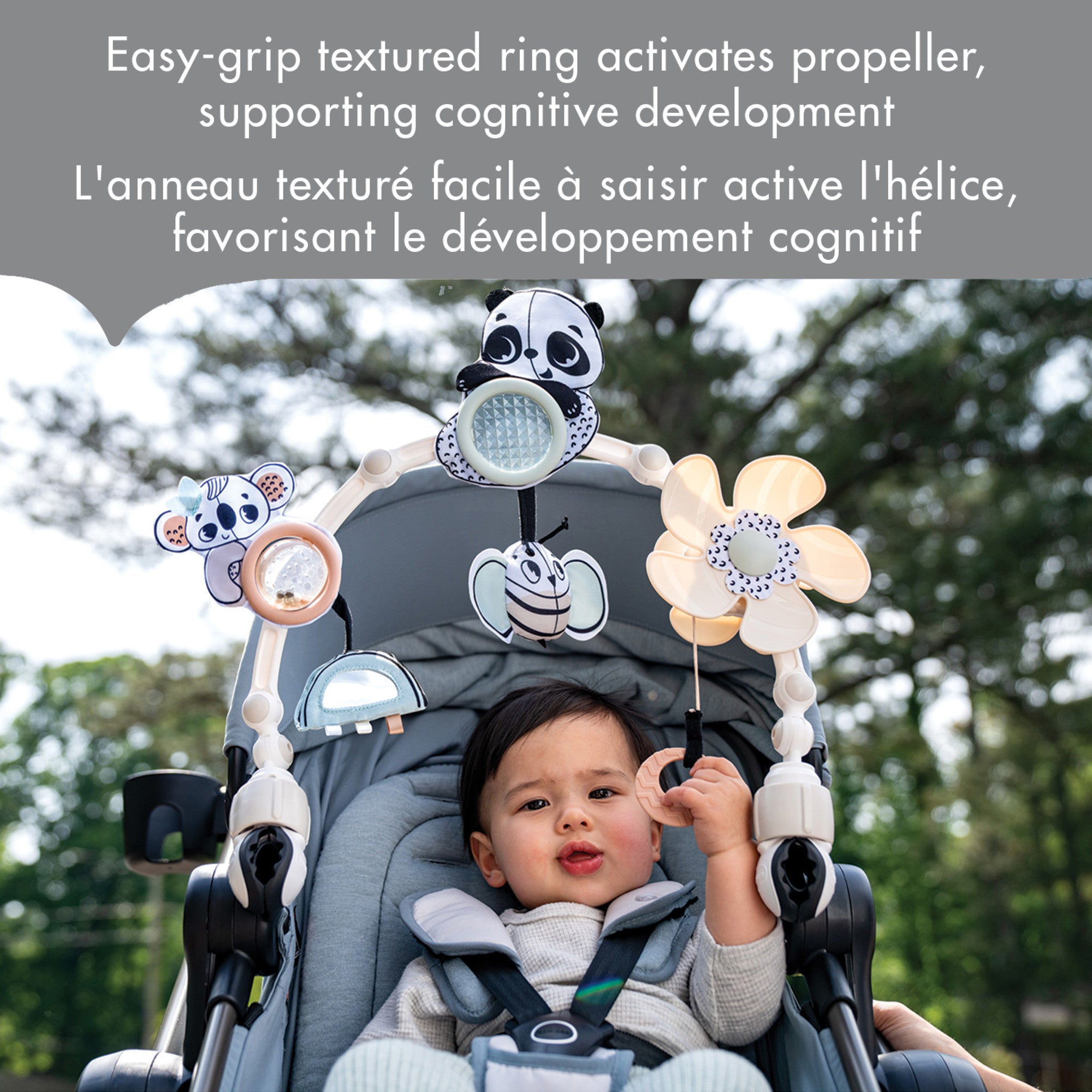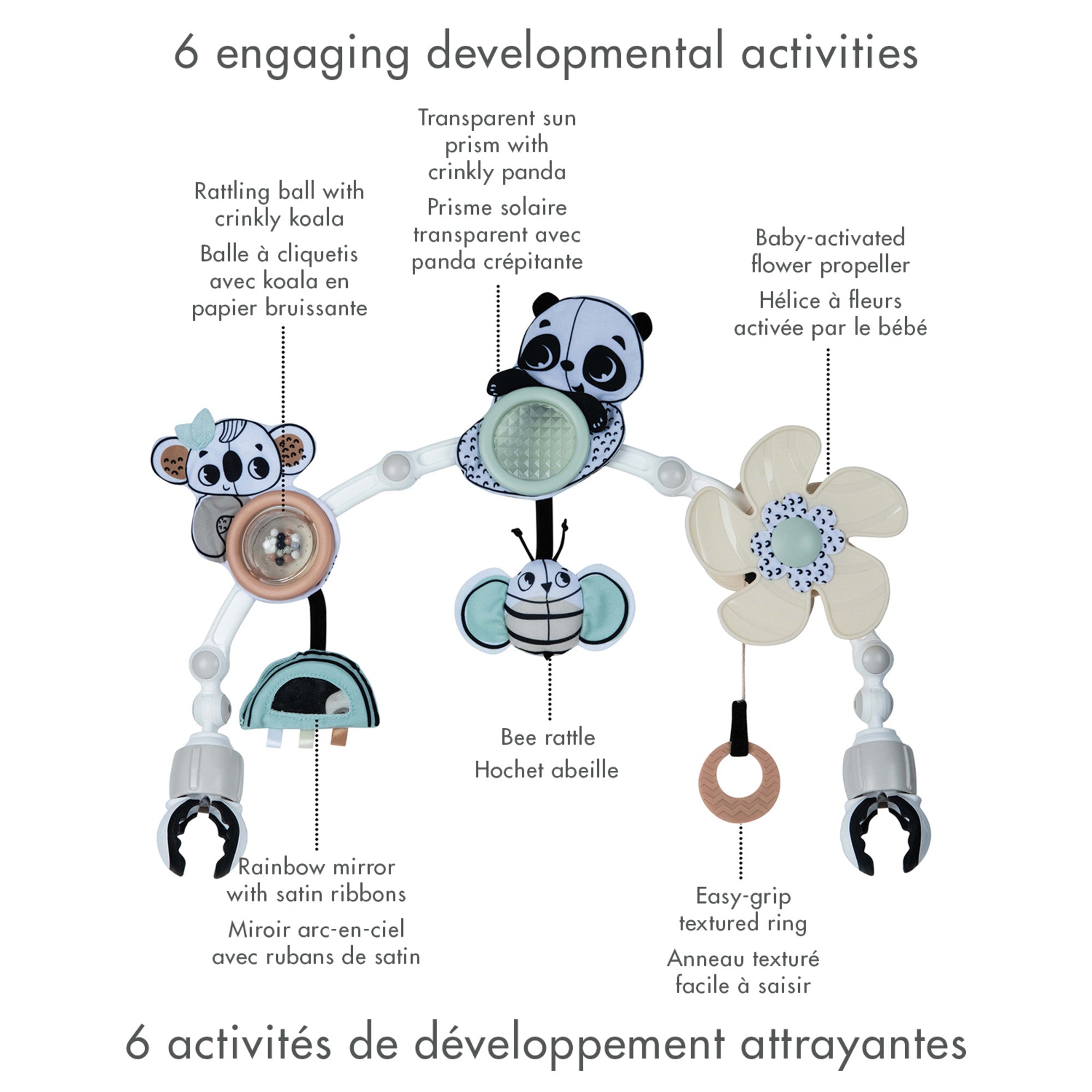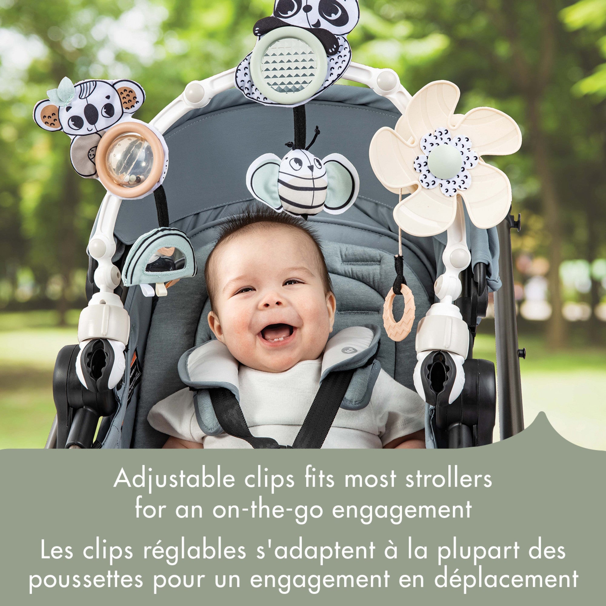 L'arche de poussette encourage le développement des bébés, inspire leur sens de l'exploration et offre une sensation familière à la maison comme en déplacement. Les différentes activités offrent à votre tout-petit une stimulation audio, visuelle et tactile, et leurs fonctions réactives enseignent aux bébés les bases de la relation de cause à effet, favorisant ainsi le développement cognitif. L'angle de l'arche peut être ajusté pour permettre à votre bébé d'accéder facilement aux jouets. Les clips de fixation universels s'adaptent à la plupart des poussettes et en font un jouet de poussette idéal pour votre tout-petit.