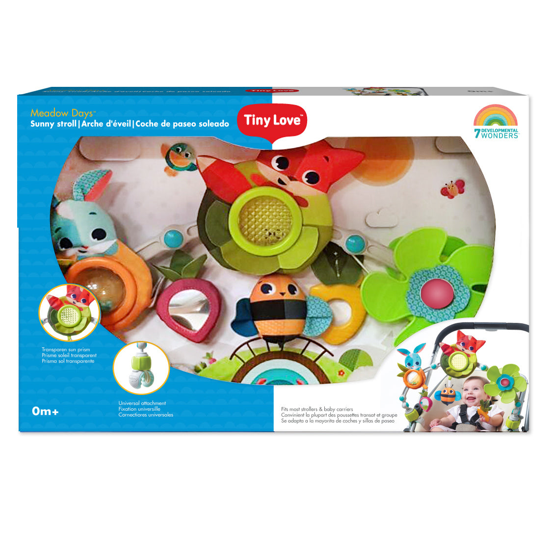 Les jouets colorés de l'arche pour poussette Tiny Love sont parfaits pour stimuler la vue de votre nouveau-né. À mesure que votre bébé grandit, ces jouets sont parfaits pour exercer sa coordination œil-main. Au début, les bébés tapotent les jouets de manière aléatoire, ce qui les fait osciller, mais ils apprendront progressivement à contrôler leurs mains et à les tapoter délibérément. Les jouets sont conçus pour être faciles à tenir et résisteront à l'exploration buccale et aux mordillements que les bébés adorent donner. La flexibilité de la Sunny Stroll vous permet de moduler le niveau de stimulation grâce à un simple réglage de l'arche pour adapter le champ de vision de votre bébé. Vous pouvez également replier l'arche pour permettre à votre bébé de se concentrer sur un ou deux jouets seulement s'il est surstimulé. L'arche réglable est conçue pour s'adapter à différents styles de poussettes et se fixe facilement grâce au clip universel.