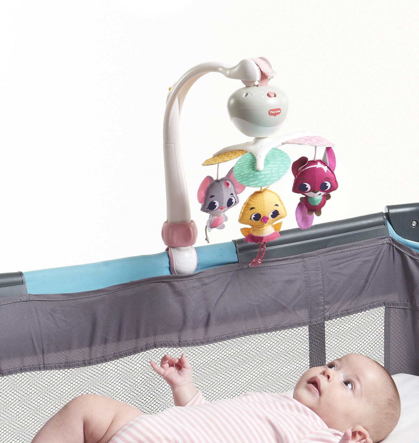 Le mobile Tiny Princess Tales™ est conçu pour accompagner le développement de votre bébé, à la maison comme en déplacement. Ses contrastes noirs et blancs attrayants et ses jouets colorés suspendus tournent pour stimuler la vue de bébé, tandis que sa vue est encore en développement. Bébé peut exercer ses compétences de communication et de langage, allongé dans son berceau ou assis dans sa poussette, en roucoulant devant les personnages souriants. Les adorables jouets Tiny Princess Tales stimulent les sens de bébé et favorisent le développement de sa motricité fine. Grâce à sa conception astucieuse, le mobile se fixe facilement à la plupart des parcs, poussettes et berceaux, ce qui en fait le jouet de voyage idéal.
