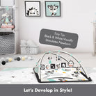 The Magical Tales™ Black & White Gymini is a stylish activity gym, designed especially to support newborn development. With 18 developmental activities and interactive toys, it encourages baby’s skills as they naturally play. Its contrasting black and white details provide visual stimulation for newborns from day one. The adjustable arches can be easily arranged in a variety of ways, or removed, to enhance your baby’s developmental environment for the ultimate tummy time experience.